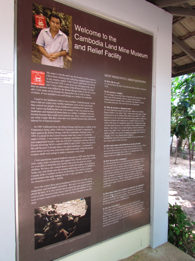 Then we headed back towards the main temple complexes. On the way out we had passed the Landmine Museum. Ten years ago, on the main road to Angkor Wat, there was the residence of a man who had been with the Khmer Rouge as a child. He had laid many landmines. He had had a gun that was bigger than he was. He had worked for the regime. Then the Vietnamese came and “liberated” Cambodia. He switched to their army and laid more landmines and fought people he had previously been aligned with. Then the UN came and freed Cambodia from the Vietnamese and he was freed from his soldier life. And he came to understand what he had been doing. He saw the horrors that landmines unleashed on humans. And he decided to do something about it. So he started going out into the fields and countryside and defusing landmines.